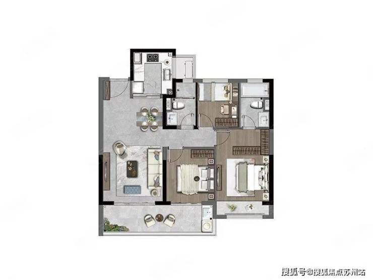 A2户型 105㎡ 3-2-2 这个户型也是三个房间朝南,南北通透,住起来很舒展。主卧同样有独立卫生间和步入式衣帽间,彰显生活品质。餐厅、客厅和厨房连成一体,U型厨房操作方便。双开间阳台很宽敞,可以欣赏美景。