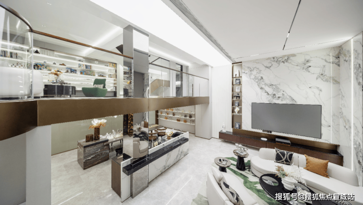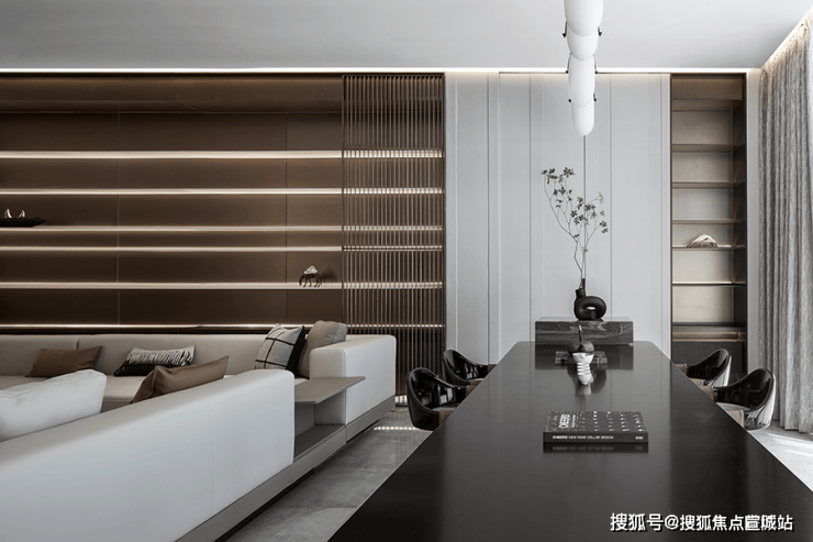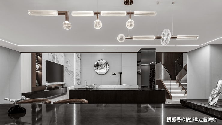餐厅 厨房与楼梯间,设立了开放的中岛台,形成视觉隔断,在增添功能性的同时,也流露出设计师严谨的美学思考,以及对空间节奏的把控!沿梯下行楼梯利用灯光,呈现出轻盈的悬浮感,夹层作为阅读空间延续了整体色调,在黑白之中求得平衡 不张扬 也不喧闹,弧形沙发和圆形茶几带来的包围感!