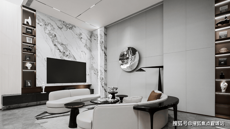 客厅在多重材质的组合下,顺畅融汇 秩序井然素雅的基调来自比例的精准把控和色彩的考究搭配,克制之间彰显出游刃有余的平衡之道!电视背景墙利用石材自身纹理,将水光潋滟的迷人景象引入室内,沙发后方的展示柜高低错落线条置于其上,玻璃和金属交融出迷濛光影!