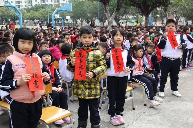 在今天上午一中附小举行的2018年春季开学典礼暨第四届爱心节启动仪式上,校长代表学校向老师、同学们致新年祝愿,并给各班送上挥春。
