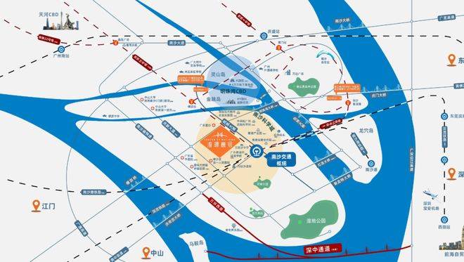 位置是项目最大的亮点之一。它坐落在南沙万顷沙板块,属于南沙枢纽区块的核心地带,紧邻规划中的综合生活服务区和商业中心。地铁18号线万顷沙站就在项目附近,大概2公里左右的距离,这条快线设计时速很高,通勤效率在南沙片区算得上顶尖。从这里出发,30分钟左右就能直达珠江新城,相比其他板块的总价和首付门槛低不少,性价比在广州东南西北几个方向里都很有竞争力。深中通道的通车进一步放大了交通优势,让项目到深圳前海的实际距离和时间都缩短明显,未来跨城通勤会越来越方便。加上周边规划的八轨交汇,包括高铁、城轨和地铁,交通网络密度高,连接广深港珠澳的辐射能力很强,属于典型的轨道枢纽型社区。