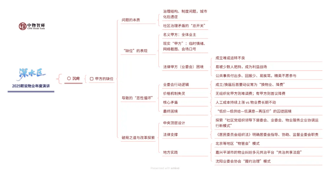 从历史维度看,深水区是制度的暗礁。如法规滞后、调价机制缺失、甲方缺位、业主与物业诉求错位、前期物业垄断等。